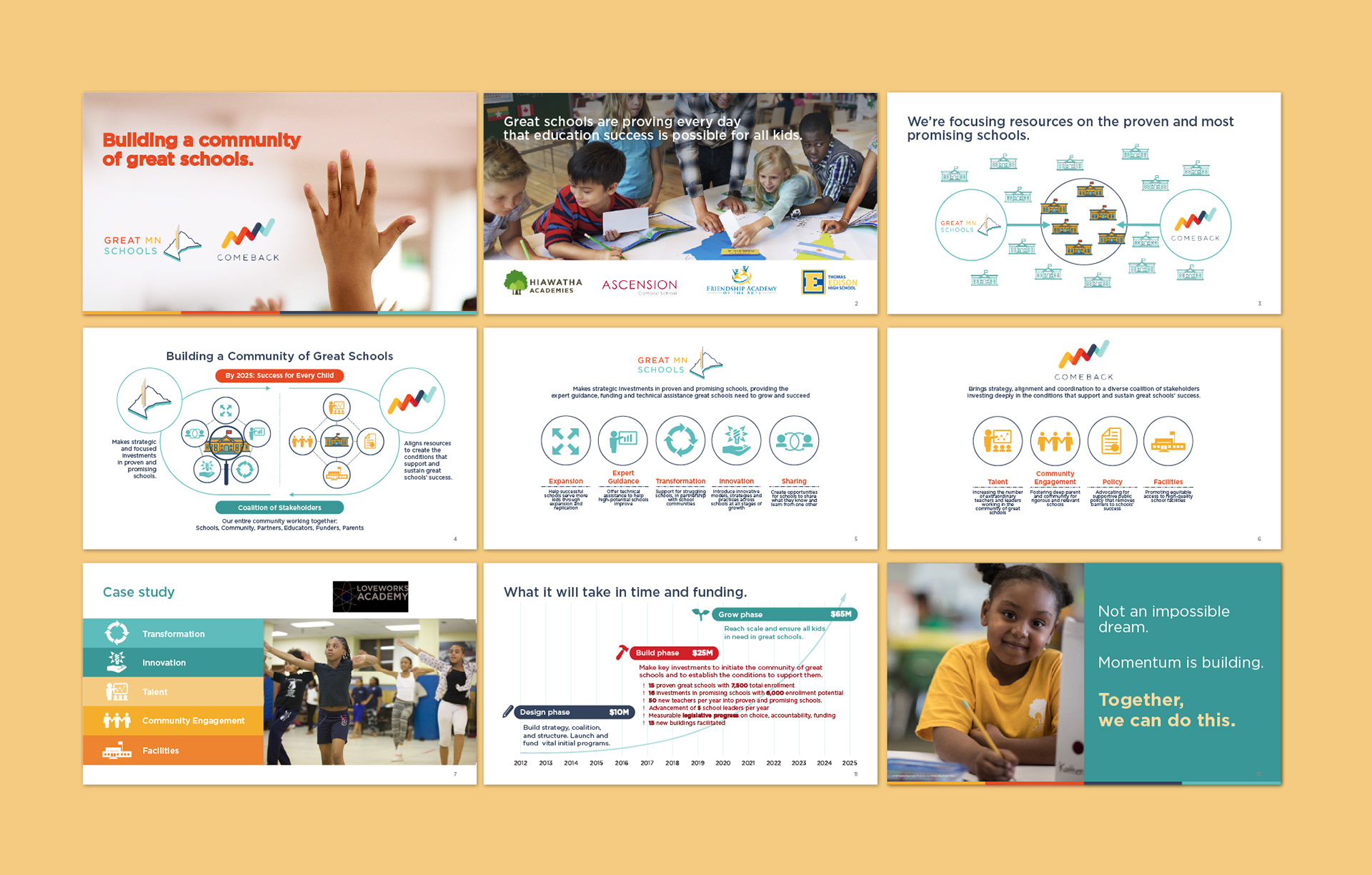 Select slides from a funder's PowerPoint deck for Minnesota Comeback, designed for pitches to funders and stakeholders. The deck featured a vibrant design with real images of students and dynamic infographics that clearly outlined the educational challenges, the impact of the initiative, and the funding 'ask.' The visuals were crafted to be both compelling and digestible, ensuring key messages resonated with potential supporters.